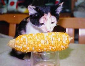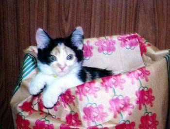 いた、いた。ニーニーと声の限りに鳴いて・・・。近づく私を恐がりもせず、いえ、怖くて立ち竦んでか、動かずに鳴いているのです。三毛猫でした。話しかけながらそっと両手で抱くと、それはもう猫ではなくて、声を出す20センチ位の毛の毬でした。 | |||